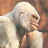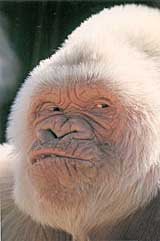 | Pero nunca se ha conocido ningún otro caso en gorilas. Ni siquiera los mitos de las tribus guineanas ni de toda África recogen ninguna referencia que nos pueda hacer sospechar que en el pasado haya existido ningún otro gorila blanco.Por este motivo, Copito de Nieve, con su pelaje blanco, la piel rosada y los ojos azules, es un ejemplar completamente único y excepcional. Cuando el centro de Ikunde se hizo cargo de él, el pequeño gorila pesaba 8,75 kilogramos, tenía la dentadura de leche completa y los guineanos lo llamaban Nfumu, que significa "blanco" en lengua fang. |