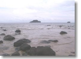 La gran Bahía de Luba aparece, como salida de la penunbra, sobre la carretera de circunvalción que viene de Malabo. Seguimos durante algunos kilometros la gran curva, la Bahía de Luba, antes de llegar al pequeño puerto que lleva el mismo nombre. Al fondo en la foto, isla loro. |